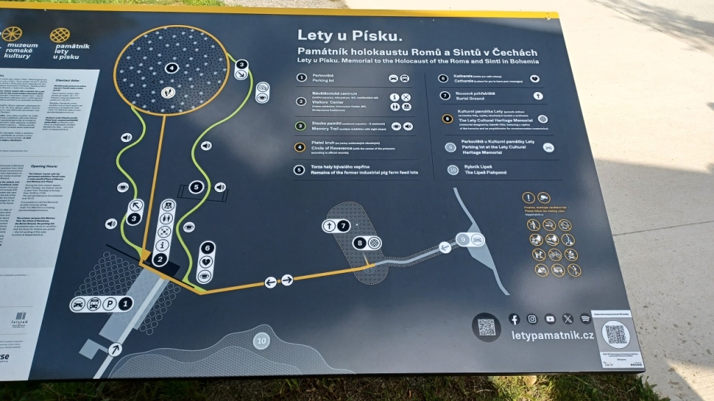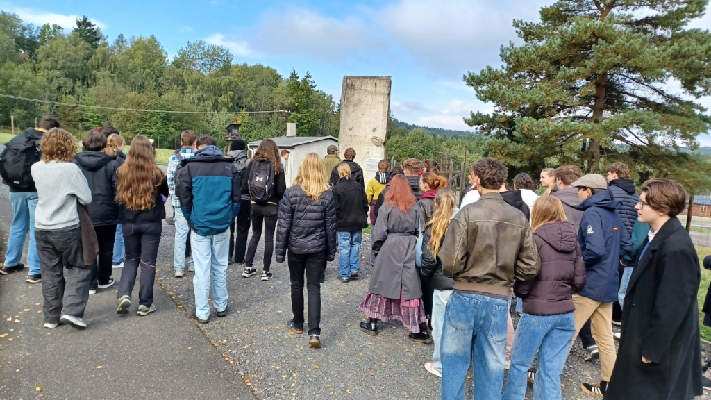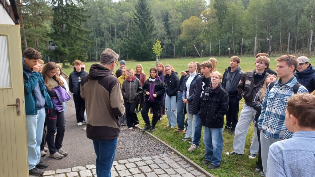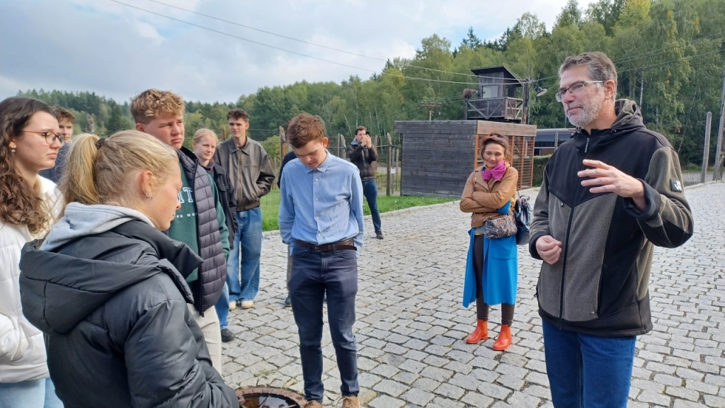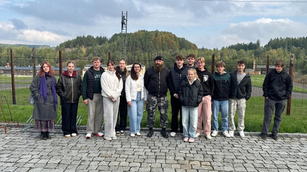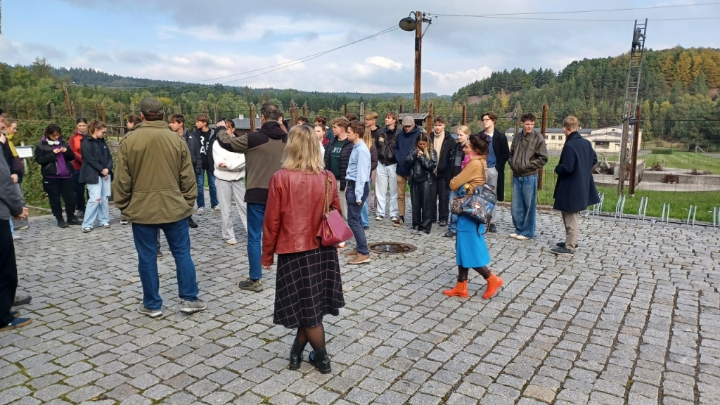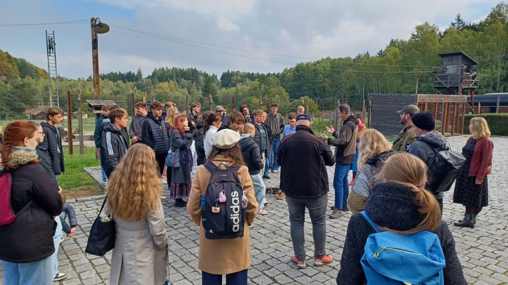 Dalšími účastníky exkurze za historií 20. století byli studenti libereckých gymnázií F. X. Šaldy a Jeronýmova, a také studenti historie Technické univerzity Liberec. Vše pod skvělým vedením historičky Mgr. Kateřiny Portmann Ph.D., která na TUL působí. Naší první zastávkou se stal památník Vojna. Tábor původně vybudován pro německé zajatce z 2. světové války, později využit komunistickým režimem jako pracovní tábor pro politické vězně. Zdejší vězni byli nuceni k těžbě uranu, který následně využívalo SSSR pro svůj jaderný výzkum. Druhou zastávkou byl Památník holokaustu Romů a Sintů v Čechách. Na tom to místě za 2. světové války stával sběrný tábor pro Romy a Sinty. V 70. letech zde byla postavena velkovýkrmna vepřů, která z části zasahovala i do bývalého tábora. V roce 2017 areál odkoupila Česká republika a už přes rok je zde otevřena stálá expozice věnována památce Romů a Sintů. My jsme jejich památku uctili zapálením svíček u památníku vedle masového hrobu.