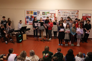 V pátek 20. 12. 2024 se na chodbě před učebnou hudební výchovy uskutečnil tradiční vánoční koncert. Ten v půl deváté zahájili sourozenci Bádalovi, kteří nám popřáli příjemnou zábavu a šťastné prožití vánočních svátků.